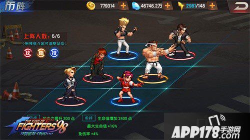 前排需要3个比较抗打的格斗家来抵抗较多的伤害,推荐草薙京1号位、大门五郎2号位、雅典娜3号位。后排格斗家主要负责输出,所以放置3个单体输出能力较高的格斗,红丸4号位、微丝5号位、麦卓6号位。这样的布置配合上天赋效果可使得前排的格斗家抗打击能力更强,后排的输出能力也能得到提升。