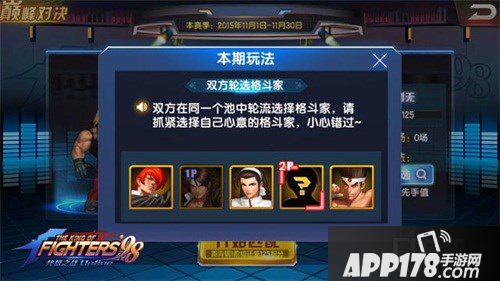 在《拳皇98终极之战OL》中,对手是无法自行决定,是跨服匹配,但出战阵容在一定程度上是可以自行决定的。在选取格斗家的界面上,会出现数个不同类型的格斗家供双方进行轮选,其中部分格斗家隐藏头像,只显示问号标志。在选取格斗家时,抽到对战后手的玩家可以优先选取一个格斗家,此时一定要抓住机会,如果场上出现八神、大蛇、卢卡尔这些BOSS级格斗家最好优先入手!如果明面上没有自己理想的格斗家,也可以尝试选择隐藏格斗家,说不定炎之克里斯、大地七枷社等高攻或高防格斗家就在其中。
