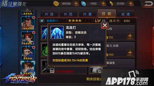 而那么在培养上,八神、炎之克里斯、罗伯特在第一战魂16级之后重点培养第二、第四战魂;豆包和比利、百合或者哈迪兰则是在第一战魂升级到13级后可以开始转向对第二、第三战魂的培养,毕竟第三战魂在升级满后大概能提高10%的技能释放率,可以大大提高我们的运气成分,别小看这10%的技能释放率,因为这是6个人的团队,多10%的释放率可以保证基本上每个回合都能有一个人释放技能,这样我们的胜利会更有保障一些。