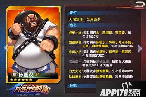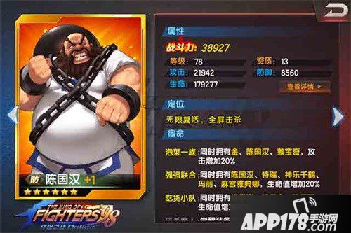 当然百搭款的陈国汉就是用来吸收伤害的,其余的搭配也可以根据各位的喜好进行选择搭配。不断涌现的格斗家,也让游戏阵容千变万化,一代版本一代神,随着游戏版本的更新,相信也会有不同的搭配让这位呆萌的人肉轰炸机大叔绽放其光彩!