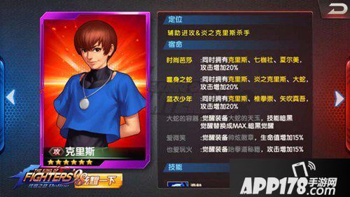 在《拳皇98终极之战OL》中,新格斗家克里斯属于攻击型格斗家。克里斯的小技能和必杀技均为单体攻击,且输出能力较强,并能对目标造成双方面的负面效果。克里斯作为大蛇的容器,最为可怕的地方莫过于拥有像大蛇一样的几率性的复活技能,在对战中,阵亡复活后将更加可怕,可直接变身为炎之克里斯,并且还能继承之前的怒气值。