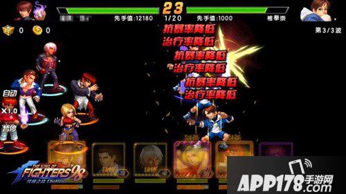 在副本对战中,所有格斗家都满怒的情况下,有序地释放每一个格斗家的必杀技,可使接下来的格斗家输出更给力。一般情况下首先是释放克里斯的必杀技,减少目标一排的抗暴率,和受治疗效果,且敌方阵容中如果有炎之克里斯的话,无论任何位置都能对其造成额外伤害。接着使用罗伯特的必杀技,增加2、4、6号位格斗家的暴击率。然后使用K’的必杀技,再次增加后排格斗家的暴击率。