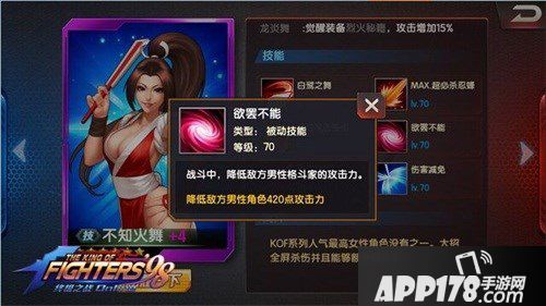 在《拳皇98终极之战OL》中,首充60钻石即可获得三星不知火舞。拥有一定经济实力的玩家甚至可以通过购买VIP礼包把不知火舞迅速提升至六星,并且将武器觉醒。想必大家都还记得,每个新区拳皇征程刚起步的时候,竞技场前十那齐刷刷的一排火舞,婀娜多姿、潇洒无比。爆炸般的伤害,坚挺的生命和防御,远超其他格斗家的战斗力,都足以让火舞傲视群雄。随着时间的推移,玩家手中的格斗家越来越丰富,星级越来越高,火舞渐渐被玩家手中的其他格斗家夺去了风光。于是大家逐渐感觉火舞只是前期强悍,后期无用,纷纷选择放弃。难道火舞真的只能在前期使用吗?