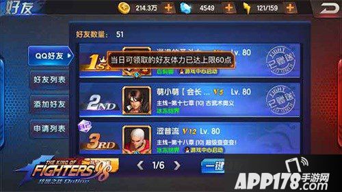 好友系统在《拳皇98终极之战OL》里分为实际QQ好友或者微信好友(登录渠道不一样这里有点不一样)以及游戏本区内的虚拟好友。大家都知道在这个游戏中体力是一种非常稀缺的资源,体力就直接可以用钻石来衡量,第一次120体力50钻第二次50钻第三次到第六次100钻每次。往后越来越贵,而好友系统不论你是体力兑换到多少次,你都会发现这里的体力是可以免费领的,每个实际好友每日可以互相赠送2点体力,最高每日60点体力,虚拟好友同样每日可以互相赠送2点体力,上限60点体力。60+60=120点体力,那么这里就变相的帮各位节省了至少50钻石。