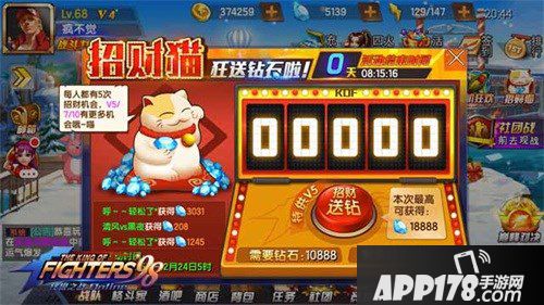 第七周也就是开服第二个月下旬,这个日子是招财猫和双倍材料活动将要到来的日子,那么攒下来的钻石和体力就有了用场,尽情的招财刷材料吧,招财后的钻石可用来购买装备觉醒宝箱,体力用来刷普通本以获取双倍技能宝石用作升品升装备。这个时候你在攒体力时所落下的战斗力和等级都能有所回升。如果平常的钻石够日常开销,那么钻石继续留作下月招财所用。招财猫只赚不亏,是拳皇98中最良心的活动啦。如果会合理利用钻石,那么14资质格斗家活动或者13资质强力格斗家活动,兜兜里的钻石也不至于捉襟见肘,见到喜欢的也有一争之力。