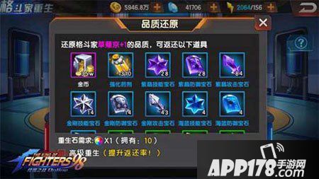 在《拳皇98终极之战OL》全新功能重生系统中,不同方面的“重生”会返回对应类型材料。品质还原,返还格斗家累计提升品质消耗的升品宝石、强化药剂及金币。装备还原,返还格斗家累计装备强化消耗的卷轴、升品宝石及金币。技能还原,返还格斗家累计技能升级消耗的金币。战魂还原,返还格斗家累计战魂升级消耗的战魂精华及金币。贴心的各方面材料返还系统,使玩家培养新格斗家上阵时,更省心省力。
