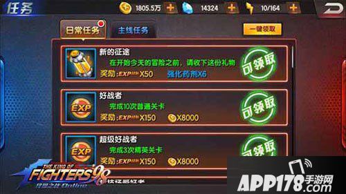 日常任务可以提供大量的角色经验,又简单,每天随便点点就完成;日常活动可以获得大量金币、经验道具、美食、格斗家碎等,每天必参加,一个不能落下,比如社团战、社团副本、金币副本、拳皇争霸、试炼之塔等。