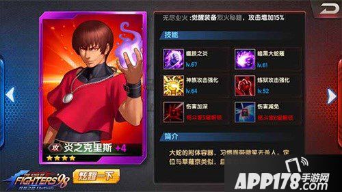 炎之克里斯:普通技能单体攻击,有30%概率造成灵魂灼烧;必杀列攻,有65%概率造成灵魂灼烧;两个被动一个永久增加自身攻击,一个增加全队暴击率。