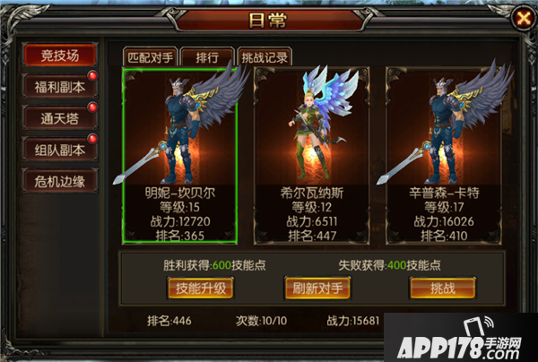 1v1竞技场,对手AI操作也不错,事先要把自己的装备能力搞好,建议在竞技榜更新时再进行pk,因为每天结算时,排名越高奖励越高,可以针对性的选择挑战对手