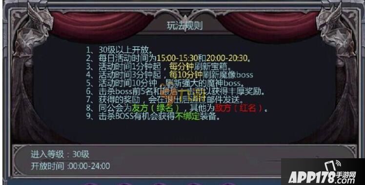 B、每天15:00-15:30,20:00-20:30刷新宝箱和boss,击杀有BOSS前5名和最后一击可以获得丰厚奖励。
