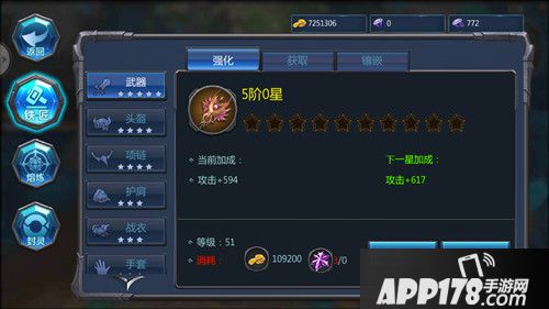 【强化】主要是养成手段,通过消耗金币及对应等级的强化石对不同部位进行强化,从而获得攻击、生命或防御的加成,进而提高战力。值得注意的是,强化属于永久保值,不受更换装备影响哦!