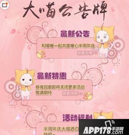 在这里不仅搜罗了最新的公告、最新的活动还有大家最关心的惊喜福利哦!有了大喵公告牌,妈妈再也不担心我找不到活动地址了!