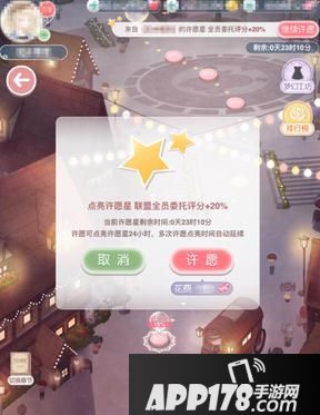 许愿星是搭配师联盟中新增的状态,联盟内的每个成员都可以点亮它,每次需要花费188钻石,可以持续24小时。在点亮许愿星之后,联盟内所有成员的委托分数可以在原有基础上增加20%,但是一次过关不包含在内。所以呢,是否点亮许愿星,就需要每个联盟自己来考虑一下了。
