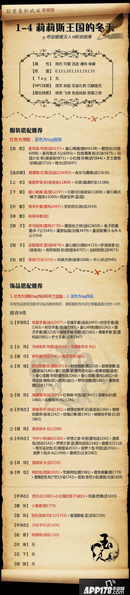 奇迹暖暖联盟委托1-4莉莉丝王国的冬天怎么搭配?属性什么?很多玩家不是很清楚,下面为大家介绍的是玩家“奇迹暖暖玉人”分享的 奇迹暖暖联盟委托1-4莉莉丝王国的冬天高分详细搭配,一起来看看吧。