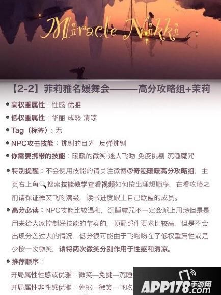 奇迹暖暖联盟委托2-2菲莉雅名媛舞会怎么搭配?技能怎么用?很多玩家对此不是很了解,下面为大家介绍的是游戏中2-2菲莉雅名媛舞会的属性及高分S搭配,供大家参考。