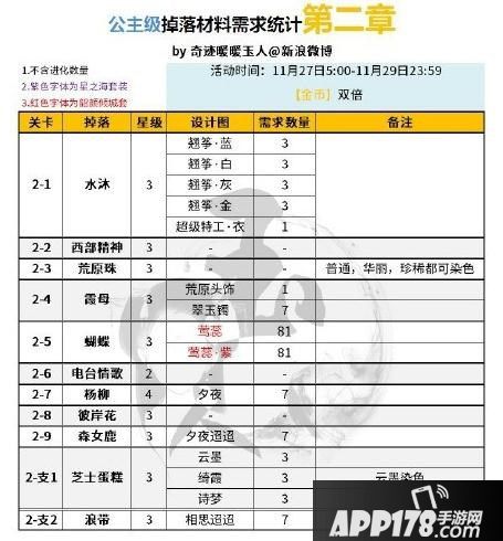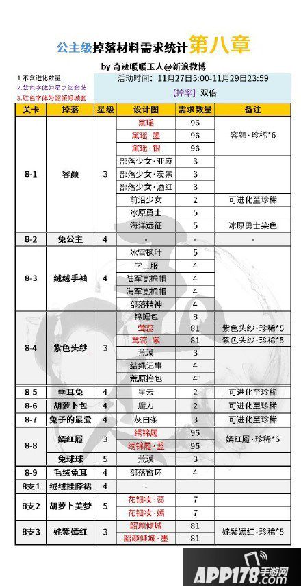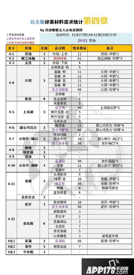 奇迹暖暖双倍活动即将开启,下面为大家介绍的是玩家分享的11月27-29日双倍活动所有章节的公主级材料掉落,一起来看看吧。