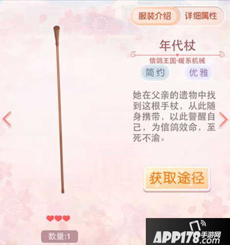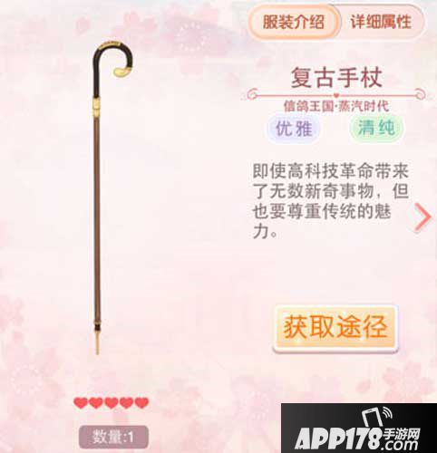信鸽王国下属的“蒸汽时代”,是一款蒸汽朋克风格鲜明的套装。在这款套装里,既有着机械革命所带来的先进元素,如齿轮、钟表,也有手杖、单镜、礼帽这样的带有传统意味的古典部件。“复古手杖”即是“蒸汽时代”里传统部件之一,两端镶金显示使用者的尊贵身份。