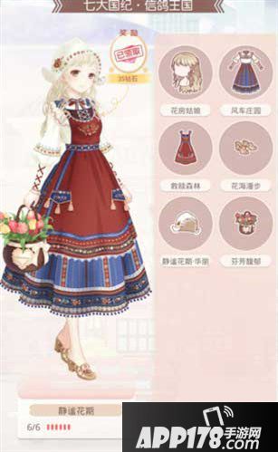 套装部件包含:发型(花房姑娘)、连衣裙(风车庄园)、外套(救赎森林)、鞋子(花海漫步)、头饰(静谧花期·华丽)、手持物(芬芳馥郁)