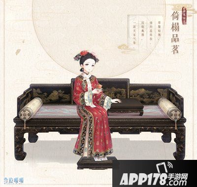 【倚榻品茗】含正常姿势与特殊姿势,精美可移动摆件“紫漆描金山水床”,海报展示妆容为“敛烟蛾”,可通过设计图制作获得。