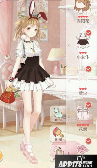 饰品:兔女郎头饰(设计图) 雪绒球大(服装店) 星星项链(成就飒爽的乐队主唱) 红色手表(服装店) 黑白腕带(成就挥洒青春的运动少女) 蔷薇恋(通关:2支2公主级)