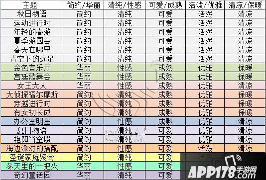 搭配时要尽量照顾到当前主题下的每一个属性要求,小编再把常见主题的服装属性贴出来大家看好哦
