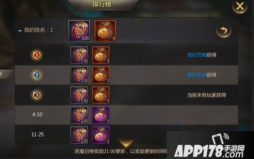 除了当每日积分达到一定时,各位可在每日奖励中获取每日恶魔之门积分奖励之外,《奇迹破坏神》还会根据玩家每日的最高积分排名,在恶魔日榜中发放排名奖励。此外,玩家本周每日的最高积分累加将会计入恶魔周榜排名,并获取相应的排名奖励。