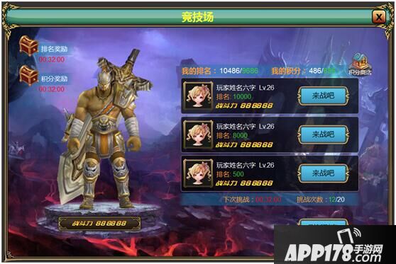 在玩家角色达到20级后即可开启竞技场,且每天均有一定竞技次数(次数用完后可以通过消耗水晶购买挑战的次数,VIP用户还能提升竞技场次数的上限。)在竞技场对战后成功挑战或是失败都可以获得相应的积分,并且可根据自己的排名领取1次排名奖励,排名越高奖励越位丰厚!