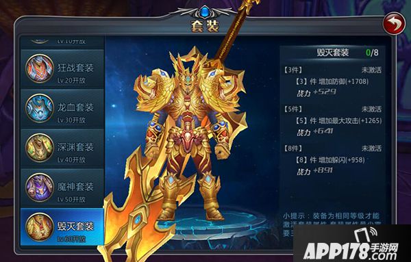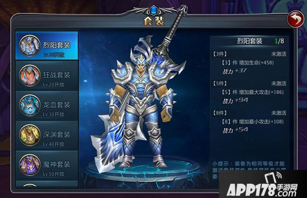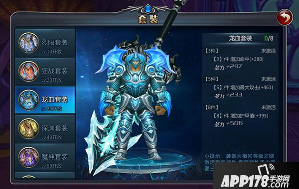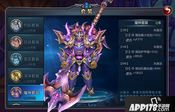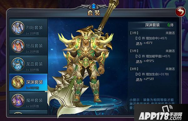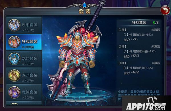 人靠衣装马靠鞍,《黑暗光年2》首轮推出的版本中,一共为战士设计了六套精美的套装。一个套装包含8件装备,包括武器,头盔,铠甲,护手,鞋子,项链,耳环,戒指。装备需要不断进行聚魂突破,拥有3件相同套装内的装备,就可以激活该套装属性。拥有5件,8件可以激活更多套装属性。