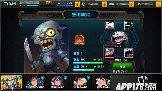 那么,如何培养你的僵尸对其进行“升级”呢?你可以通过消耗基因升级你的僵尸攻击能力和生命值。当集齐所需数量的基因后,便可升级僵尸,每种僵尸都有4个进阶基因可以对其进行合成升级。