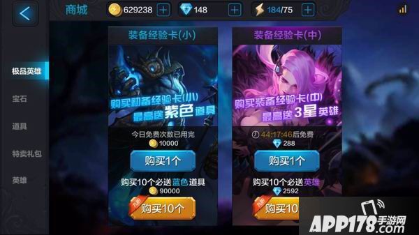 2、十连抽:划为2592钻石购买十张装备经验卡,必抽到一个英雄,当然,其他9次还是有几率获得英雄的。
