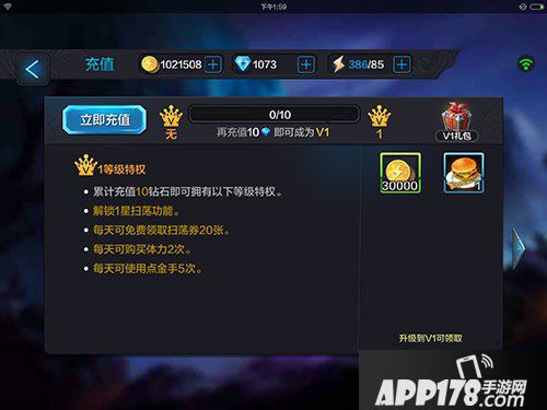 V1:累积充值10钻石可获得