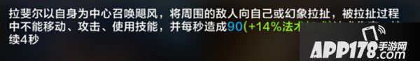 技能介绍:拉斐尔以自身为中心召唤飓风,将周围的敌人向自己或幻想拉扯,被拉扯的过程中不能移动、攻击、使用技能,且造成法术伤害。