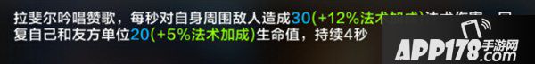 技能介绍:拉斐尔吟唱赞歌,对自身周围敌方单位每秒造成法术伤害,并持续至于自己和友方单位。