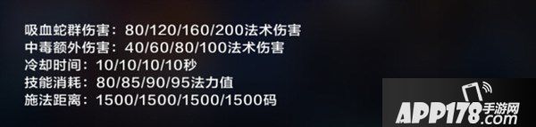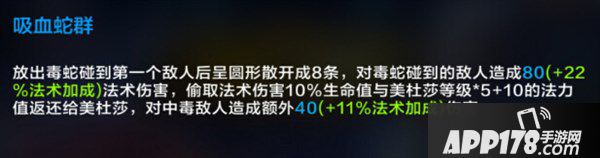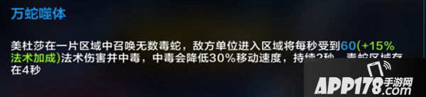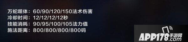 点评:核心技能,也是美杜莎的先手技能,800的距离较近,但是玩家们还是可以精准释放,该技能的伤害并不高,ap加成也仅有可怜的15%,但是中毒debuff非常强力,减速后可以让大招和1技能打出更多伤害,万蛇附体的CD也较长,高达12秒,所以玩家们一定要找到合适的时机释放来提高成功率。