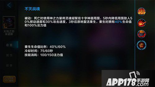 不灭战魂:被动:死亡时使用神之力量将灵魂凝聚在十字神器周围,5秒内降低周围敌人50%移动速度和30%攻击速度,3秒后原地复活重生,重生时拥有40%生命值和100%法力值。