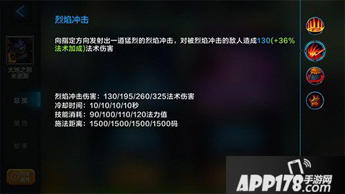 烈焰冲击:向指定方向发射出一道猛烈的烈焰冲击,对被烈焰冲击的敌人造成130(+36%法术加成)法术伤害;