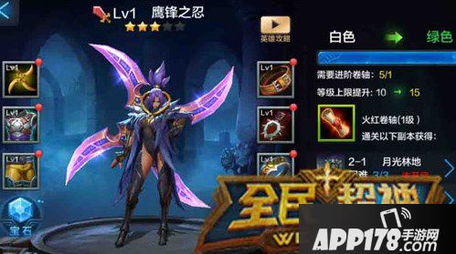 鹰锋之忍所需要升阶装备使用的材料主要来自闯关掉落,与升级顺序一样,同样装备阶级越高属性越强,英雄战斗力也越高。