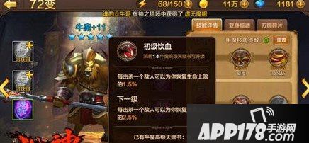 游戏中的牛魔这个变身是最大的的优点就是我们可以通过技能来达到为变身回血的效果,这是其他变身目前所没有的效果,其的天赋饮血绝对是比较赞的,所以我们可以加强提升饮血天赋,从而让其回血力量更加的强,战斗更加的长久。
