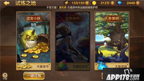 腾讯旗下首款变身战斗手游《全民斗战神》挑战玩法“试炼之地”,是玩家获取金币、培养妖精、升级神之本源的重要区域,在玩家间人气极高。在该玩法中,玩家可挑战盗宝小妖、五色神牛和人参果树三大副本,在赢取丰厚奖励的同时,超越自身战斗极限。该玩法在设定上十分有趣,且耗时较少,更凭借着丰厚的奖励成为了玩家每日必做的任务之一。