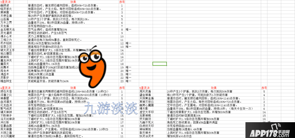 通过EX表格标注序号,(如上图),我们可以整理出相关数据,灵决共计50个,而剔除掉相同效果灵决(相同效果灵决不产生叠加效果),得出灵决共计26个,10个灵决属于唯一性,不可替代性(无更高或更低星级的该灵决)
