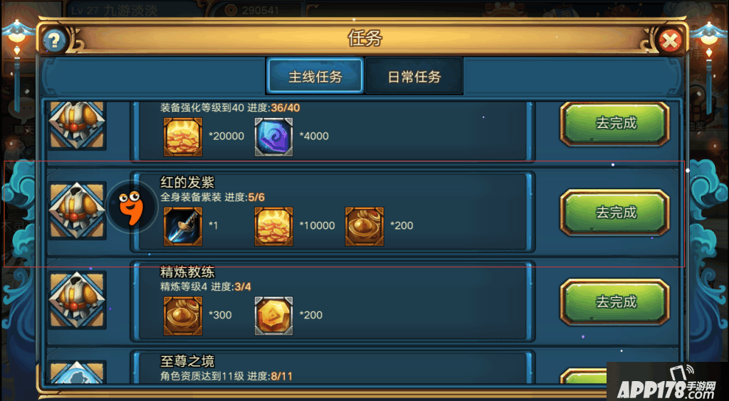任务列表一面有一个橙武任务,前提是先聚齐前5件紫色装备,如图