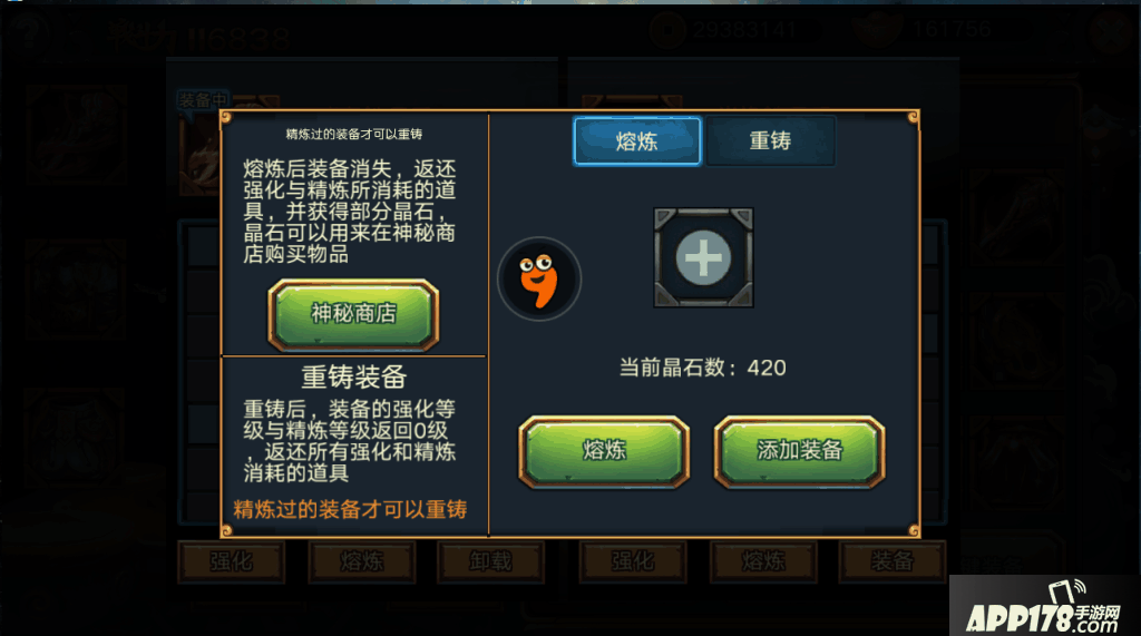 2.由于目前装备系列套装具有选择性,因此,当决定套装后,其余套装可熔炼,获得晶石,在神秘商店购买其他需要的物品。