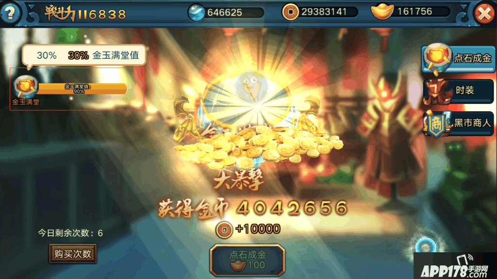 2.通过第一点积攒的金币,终究还是无法满足需求,因此,需要消耗元宝抽取。对于平民方面,抽取需要注意的是,需要积攒到一定元宝,在抽取,抽取金币有满堂值,满堂值到100的时候,会爆发,送百万金币,这点积攒性价比较高。