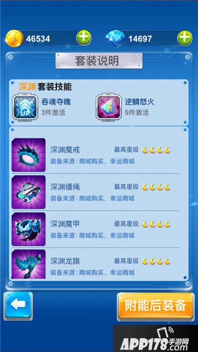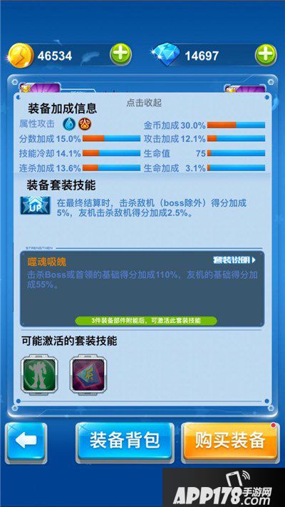 如此加强后,装备里像深渊套装,天空套装这样的人气套装战斗数值将再提高。又因装备附能的材料包括了能量点、钻石、金币、装备经验、原装备部件,原装备部件的消耗根据等级的不同,最高一次消耗4件原装备部件,因此想要进阶到最高等级也是比较难难的。但相对于升级进阶太阳套装的难度来说,月亮套装要容易一些,更容易先升到更高等级。对于起先就培养的是月亮套装装备的机友们来说,会有较多优势。但起先培养太阳的机友们也不用担心,太阳战机仍是现今《全民飞机大战》较强装备,即使没有升至最高等级也很强,并不逊色于高等级月亮装备。