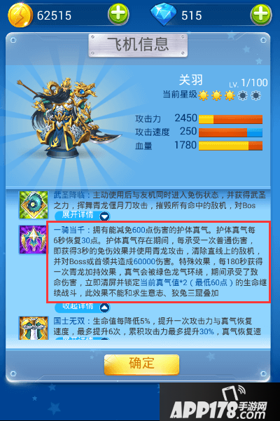 首先我们来认识一下真气,关羽提供真气的技能是一骑当千,拥有能减免600点伤害的护体真气,护体真气每6秒恢复30点,护体真气存在期间,每承受一次普通伤害,即获得3秒的免伤害效果并使用青龙攻击,清除直线上的敌机。而且每180秒获得一次青龙加持效果,并且免疫致死伤害!