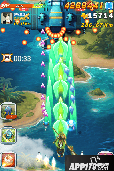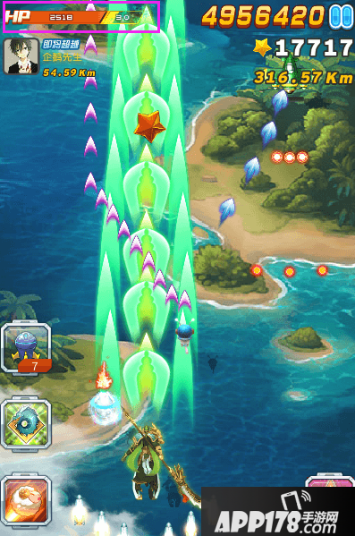 如果我们被必杀型攻击击中后,这里就会发生变化。不明白的小伙伴看下面这张截图,是不是真气管上什么都没有了,也没有真气了也没有飘荡的绿色雾气了。这就是我撞击导弹后用掉免死技能的状态,所以那绿色雾气就是免死buff的具体体现了!