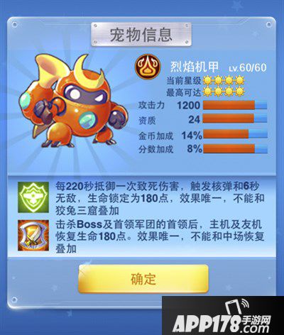 由烈焰机甲的技能就能看出来,烈焰机甲其实是冷兔和圣诞老人的结合升级版,相比小鹿更偏重于防御的宠物。作为《全民飞机大战》第三个拥有免死技能的宠物,他在保命的能力上相比小鹿会更给力。先实现免死、核弹清屏和无敌效果,再通过击杀boss后回复生命,极大增强了战机的续航能力。