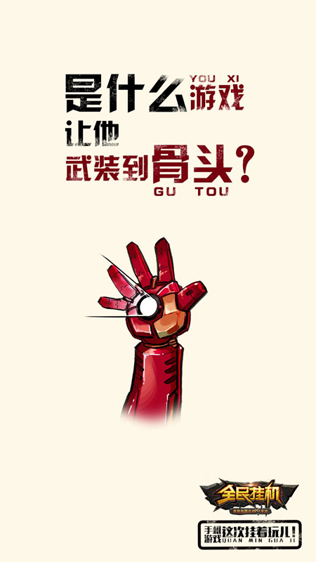 放置类RPG标杆级手游《全民挂机》(iOS搜索《挂机英雄》)资料片已于12日正式上线, 挂机手游必将再度革新。近期,电影《超能陆战队》中暖男大白的影响还未消退,《复仇者联盟2》的英雄飓风就已经再度刮起。为此,《全民挂机》推出了一系列游戏宣传海报,其中一组包含大白和钢铁侠等英雄人物的挂钩手海报一经推出,迅速蹿红网络,掀起了一阵“开挂浪潮”。