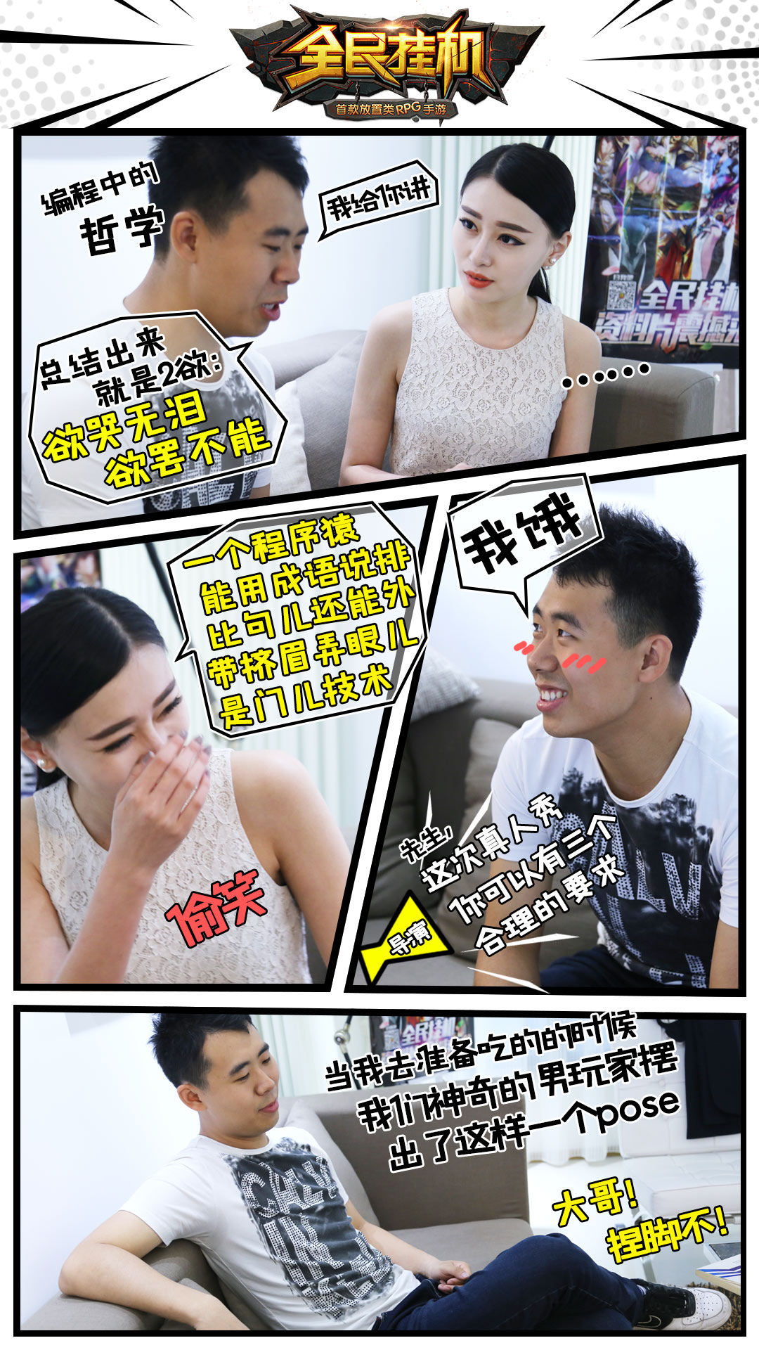 日前,《全民挂机》(iOS搜索《挂机英雄》)在其官方微社区开展了“美女主播”系列活动的第二弹,开启了“美女主播陪你共度520”的福利直播。《全民挂机》官方也在征得玩家允许的情况下全程跟拍,记录了部分获奖玩家当天的活动过程,个别有亮点的内容《全民挂机》特别制作了真人四格漫画作为纪念。