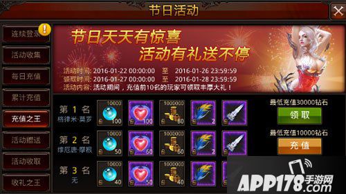 活动内容:活动期间,每日统计用户当天充值,达到指定金额即可领取奖励。